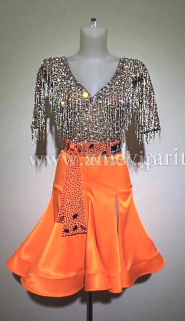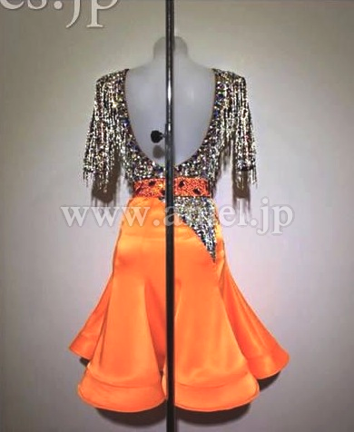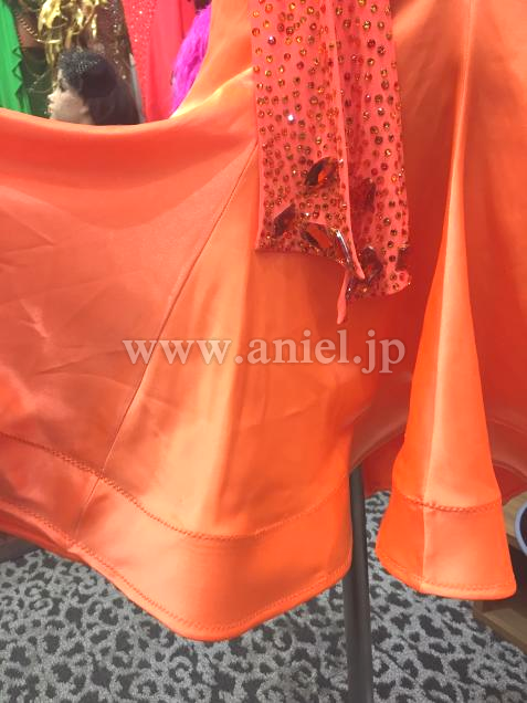 オレンジサテンのスカートは軽く、フレアの動きが美しく、しかもシャープです。