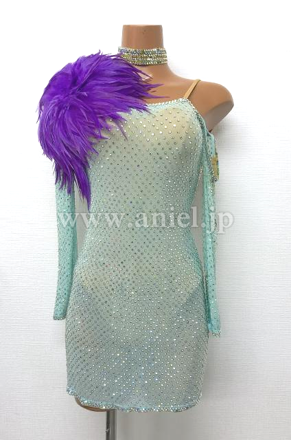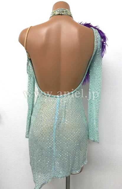 水色のロングスリーブミニ丈ドレス。