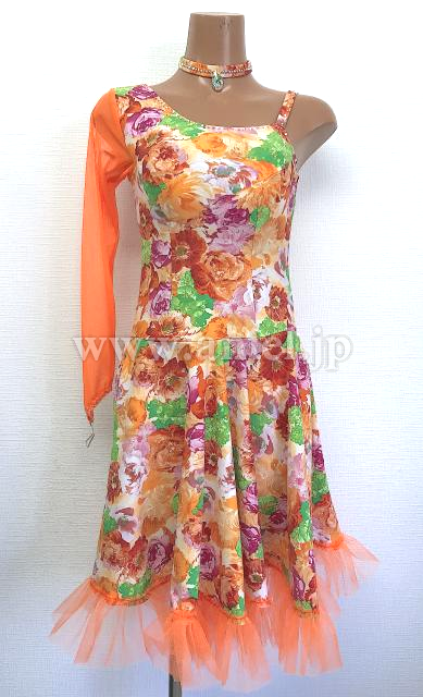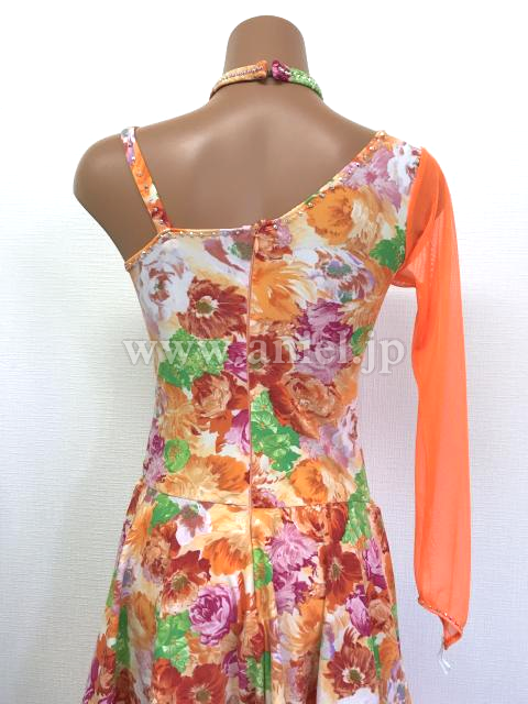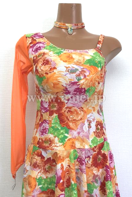 オレンジ花柄のワンショルダードレス