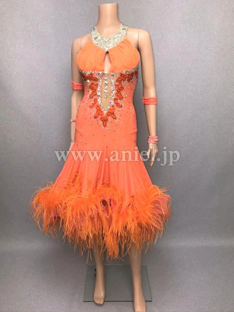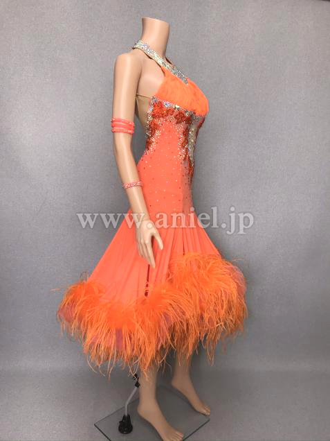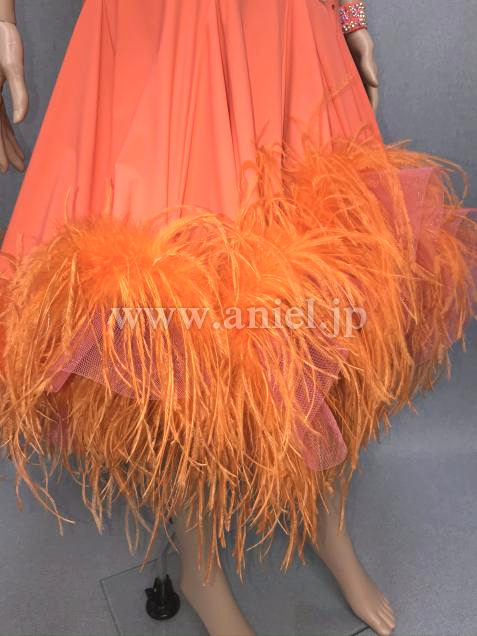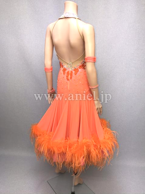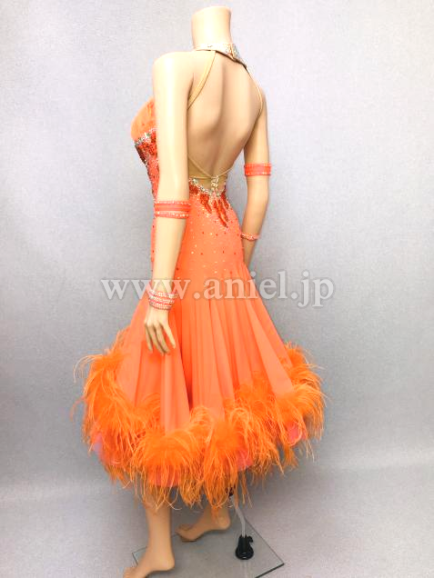 鮮やかなオレンジにオーストリッチファ―が華やかなドレスです