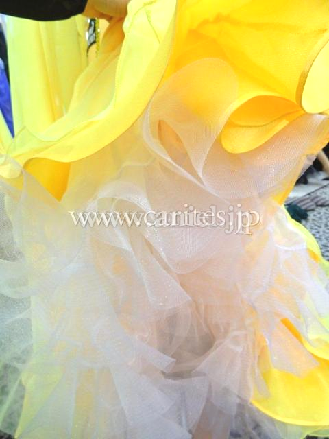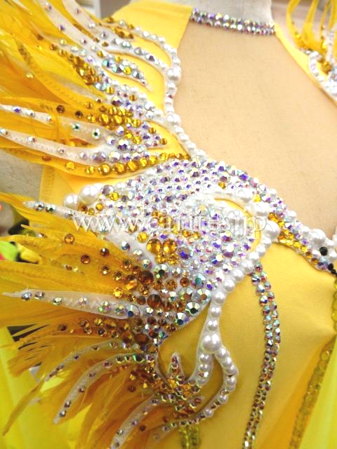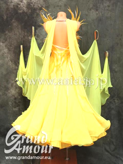 明るいサッシーイエローに、ボディは縦ライン、ストライプのシンプルな装飾です。胸元に大胆な2羽の鳥が立体モチーフとして描かれています。羽は大胆に胸元から飛び出して、ショルダーから上に向かって伸びています。顔まわりを明るく見せる効果があります。バックにも羽の立体モチーフが続いていて、見る人を惹きつけます。競技会で目立つこと間違いないです。フロートとスカートはジョーゼット。上品に大きく、優雅に舞います。