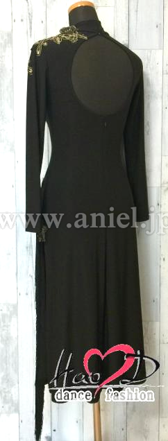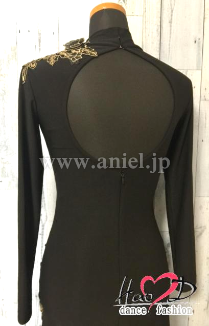 デコルテ部分にはゴールド色のモチーフを配置し、目線を上げて長身効果UP