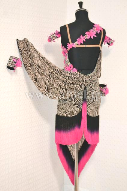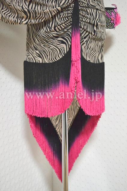 シャープに見せるVラインスカートの裾に、黒からピンクにグラデーション色のフリンジを装飾し、躍動感をプラスし、足さばきをより早く綺麗に見せる;