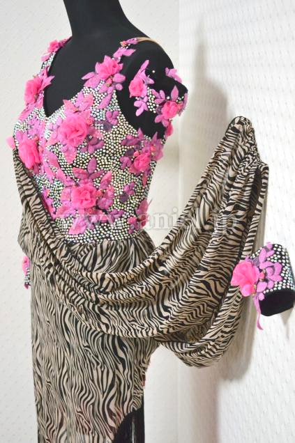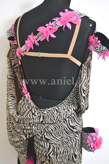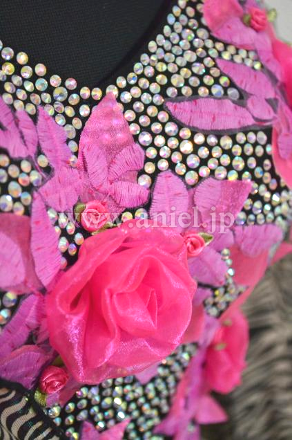 飾り→★黒いライクラ生地のインナーに蛍光ピンク色の手作り3D立体花葉モチーフを一個一個細かく縫い付け、周りにオーロラ虹色の石を満遍無く埋め尽くし;