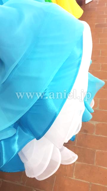 スカートは、一番上が薄いブルーのジョーゼット、2枚目が濃いブルーのシフォン、3枚目(一番中)が白のオーガンジーで裾を2枚にしています。スカートにはすべてホースヘアが入っています。