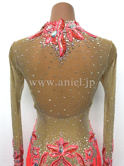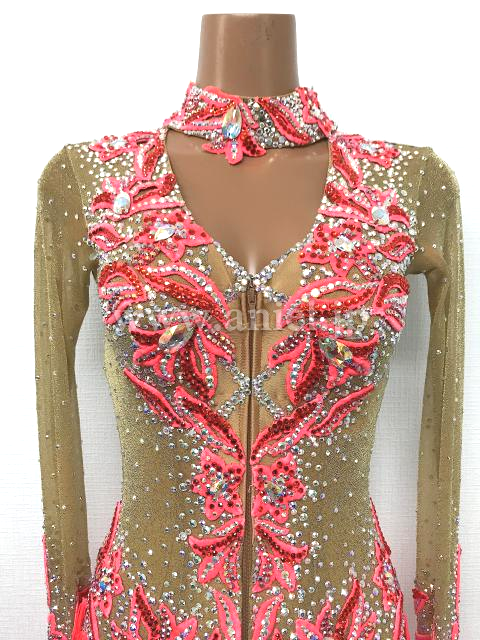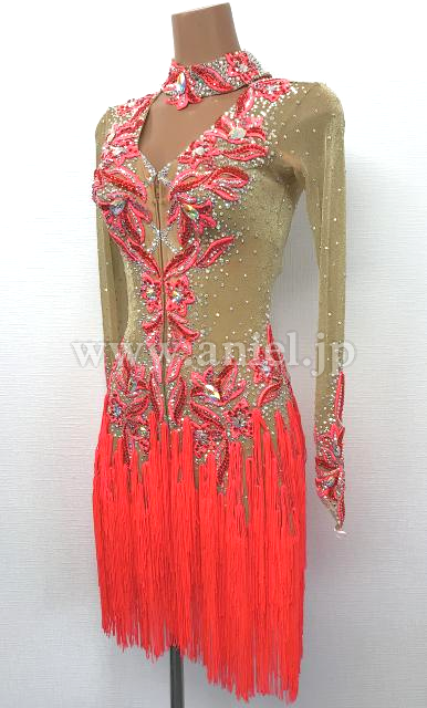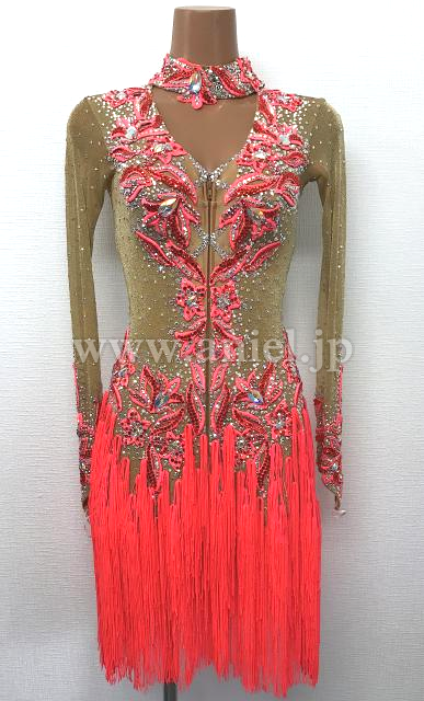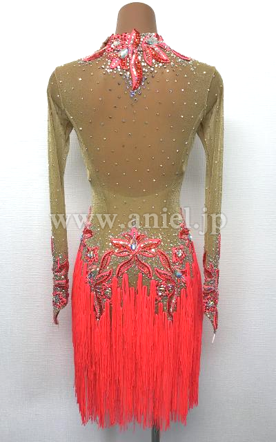 ベージュゴールドと赤のロングスリーブドレス。
