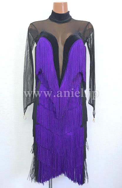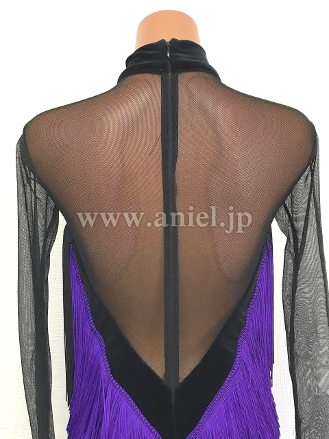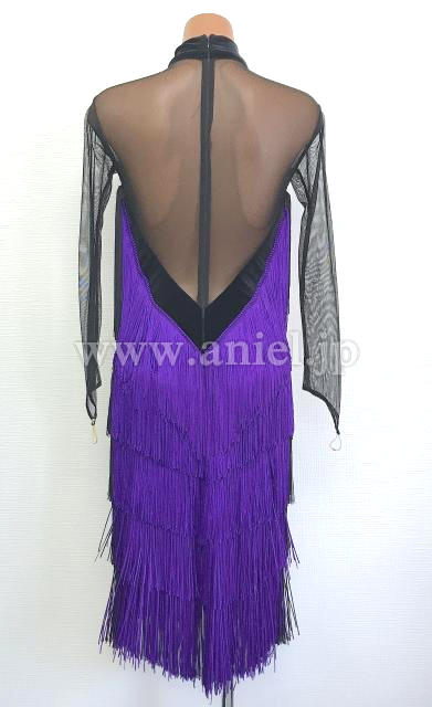 紫と黒のロングスリーブハイネックフリンジドレス