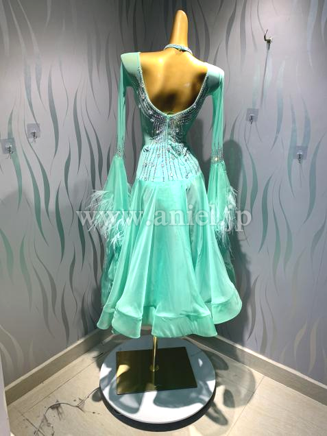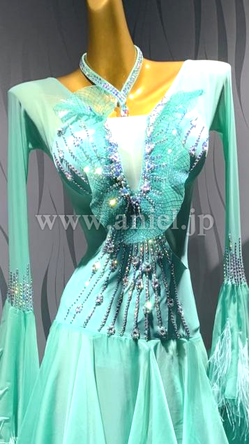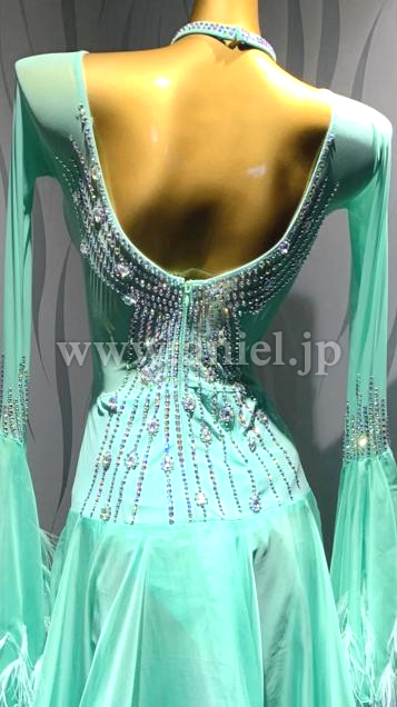 美しいペパーミントカラーに立体の装飾が映えるドレスです。