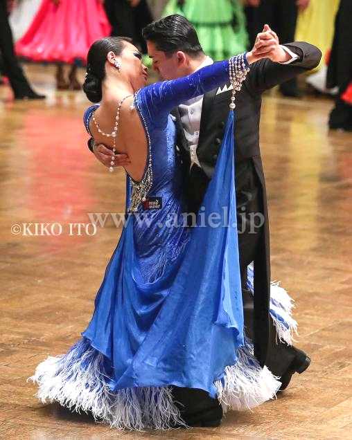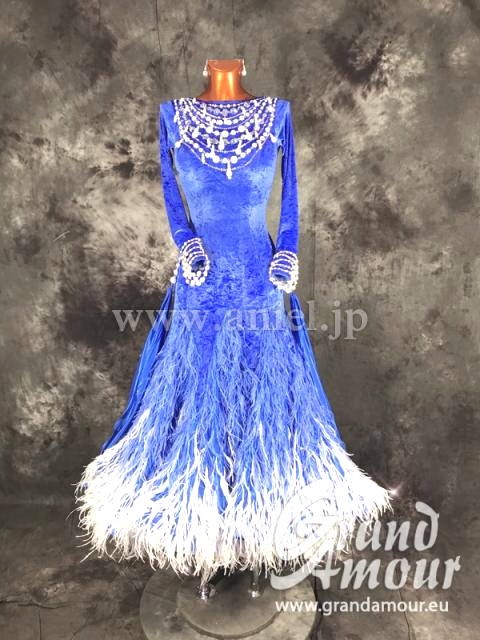 スカートには青と白の羽根がたっぷり飾られ華やか。
