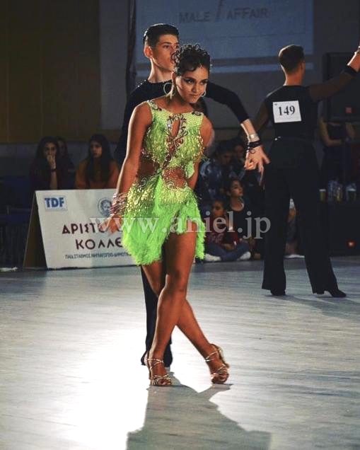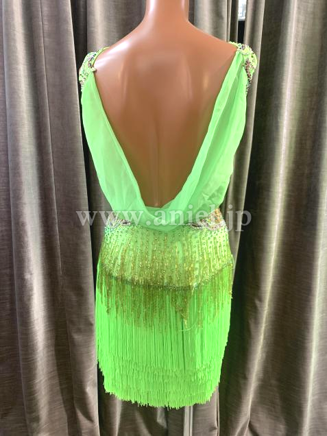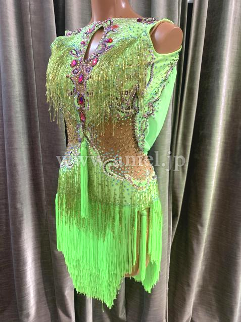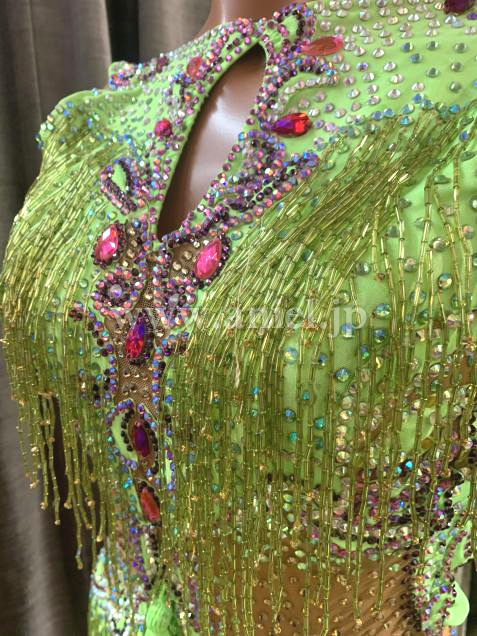 黄緑のフリンジが鮮やかで胸元も豪華で目立つドレスです。