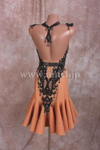 タンカラーのボディに黒のレースモチーフとストーンの装飾が豪華でシックなドレスです。