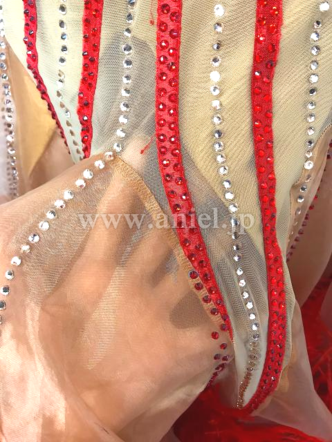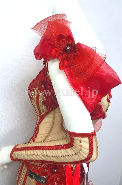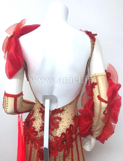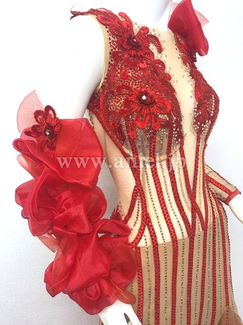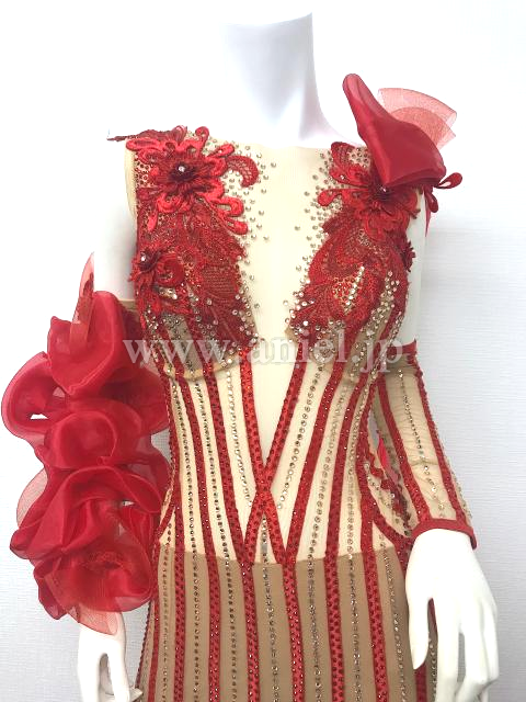 スキンカラーと赤のノースリーブドレス