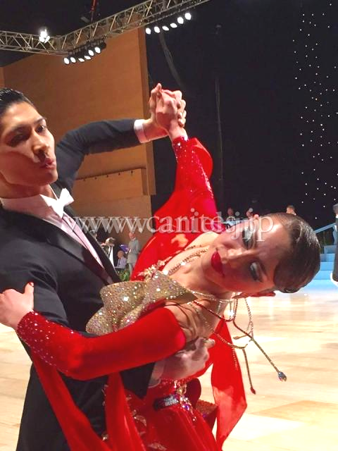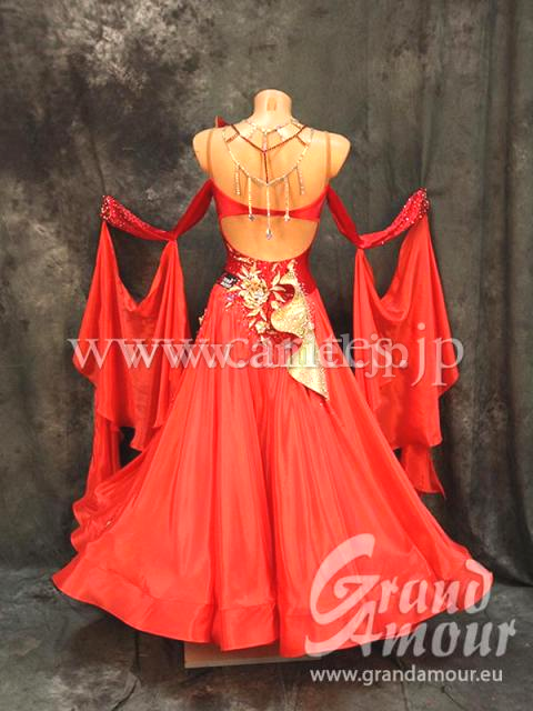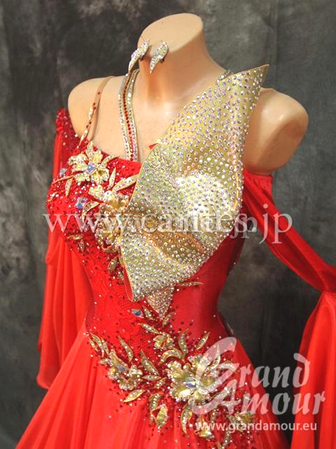 Grand AmourがスポンサーしているJBDF東部A級の金野哲也先生のパートナー、井之口香織先生のスポインサードレスです。今年のUKオープンのために製作された、比較的新しいドレスです。目の覚めるような真っ赤なスカートに、ゴールドの大きな3Dモチーフが存在感を出しています。モチーフと同様にアンダースカートもゴールドです。数回しか着用していないので状態は新品にかなり近いです。スカートはヒップの上の高めの位置から広がるデザインですが、見た目も重たくなりすぎず、よく広がって美しいムーブメントを生み出します。