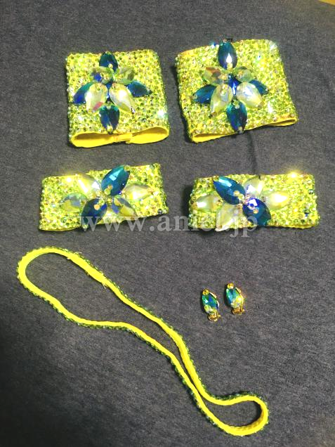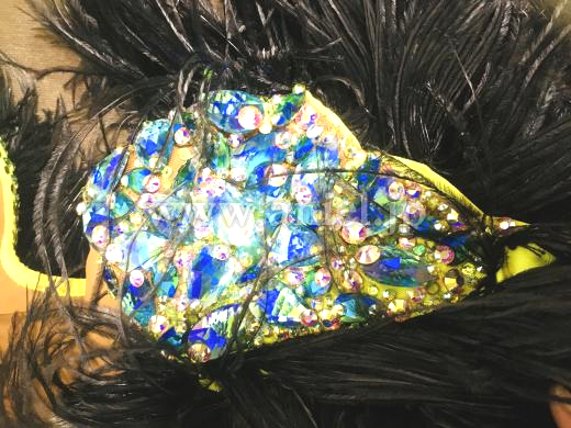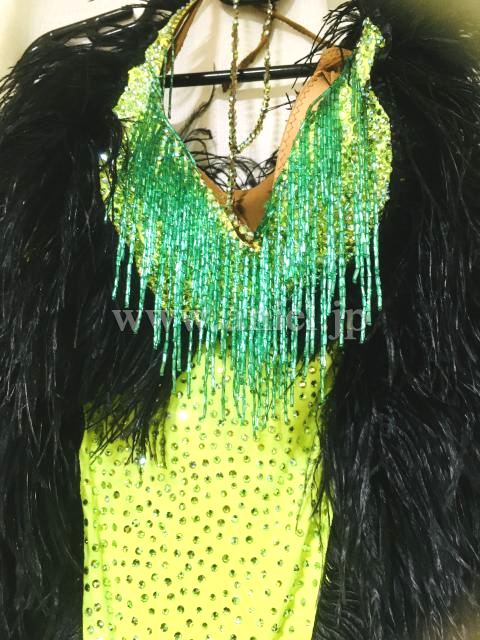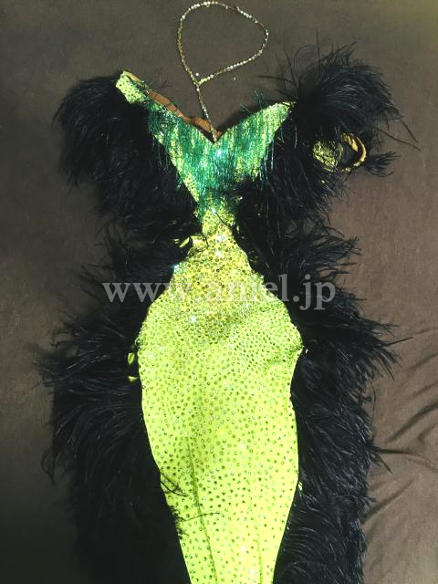 レモンイエローのボディと黒の羽で縁取ったゴージャスなドレスです。