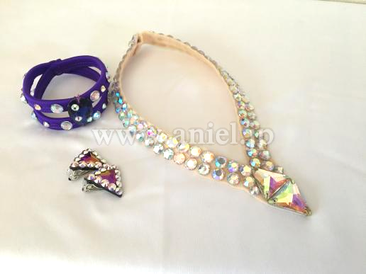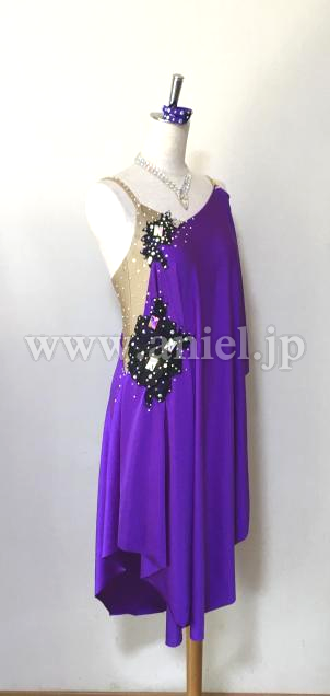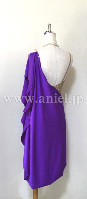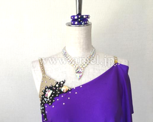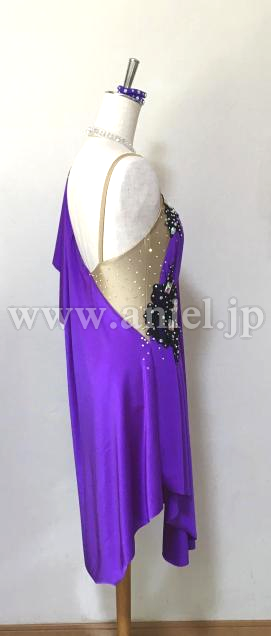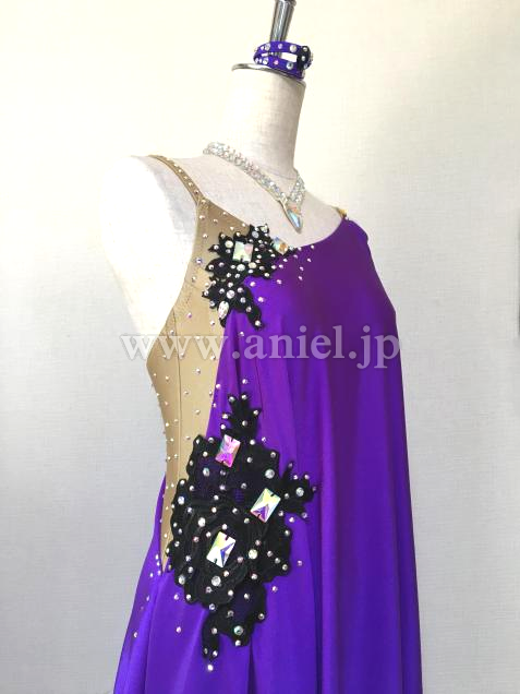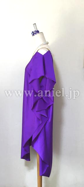 紫色の肩からのドレープが二の腕をほどよくカバーしながら、軽く良く踊り、モチーフ&ボディのオーロラストーン輝きます。