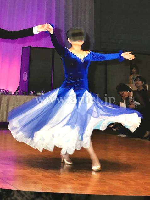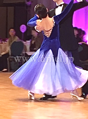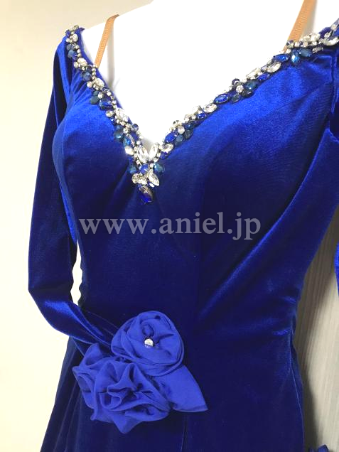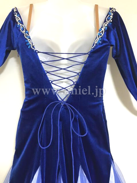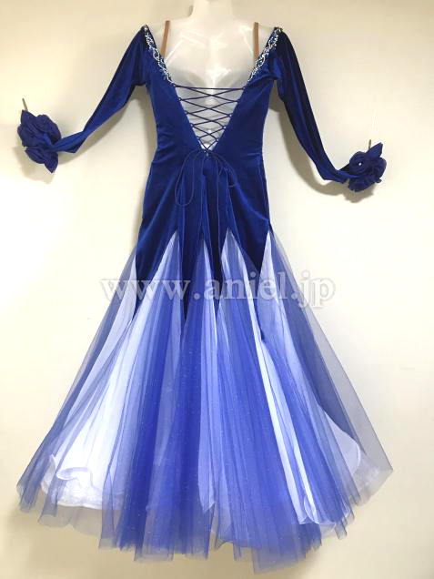 新品の濃紺ベルベットのパーティードレスをリメイク(当方洋裁心得あり)しました。石は襟元のみですが、スカートはラメ入りチュール、ペチコートは白と水色です。冬のパーティー用に作ったので長袖で、両袖口に同色のバラのコサージュ。脇ファスナーで、背中は編み上げになっています。着用時はフロート無しで踊りましたが、白のジョーゼットのフロートがあります。