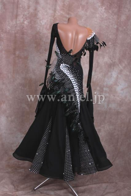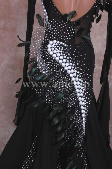 パールとドット模様の組み合わせ、ホースヘアーと羽根の装飾で立体的なドレスです。