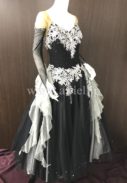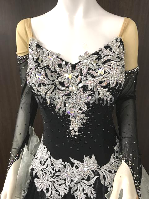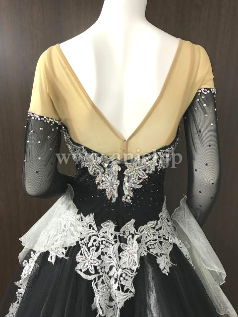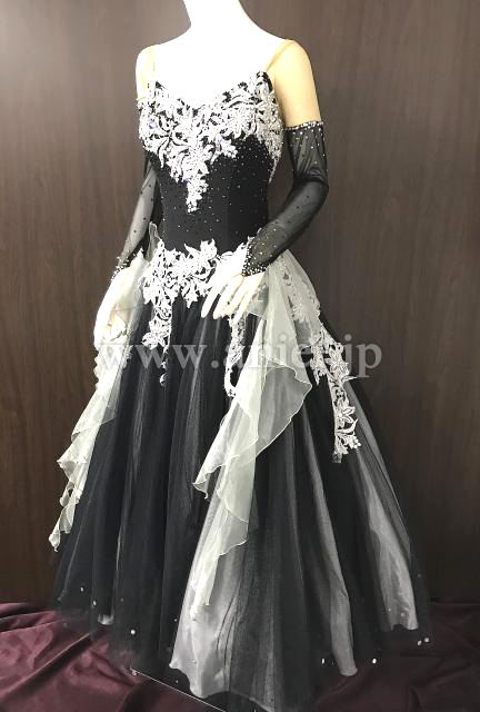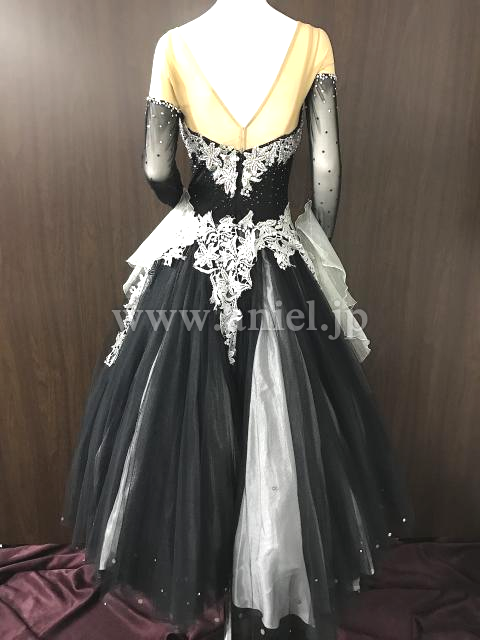 黒のボディに白のレースの装飾が映えるドレス。