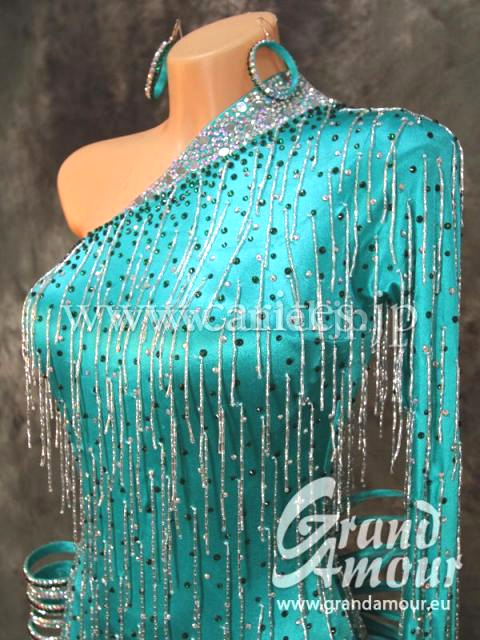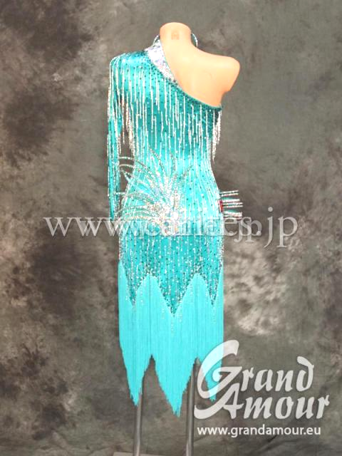 オーソドックスな形で、全般的に覆われているので肌の露出を気にされる方にはちょうどいいデザインです。ボディにはビーズフリンジ、スカートもアシンメトリーなフリンジなので非常に動きを助けてくれるデザインです。ボディにびっしりとついたビーズフリンジも、ツイスト型なので、通常の竹ビーズよりもライトに当たった時の輝きが美しいです。