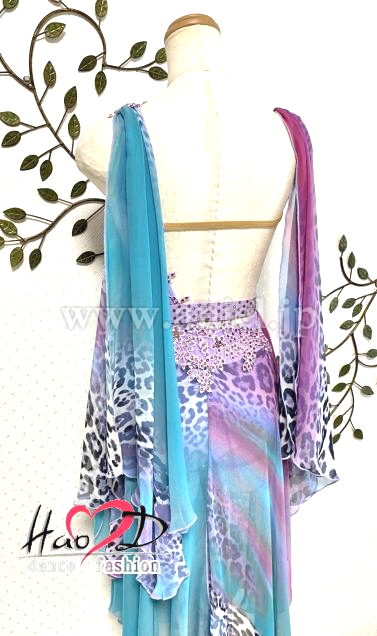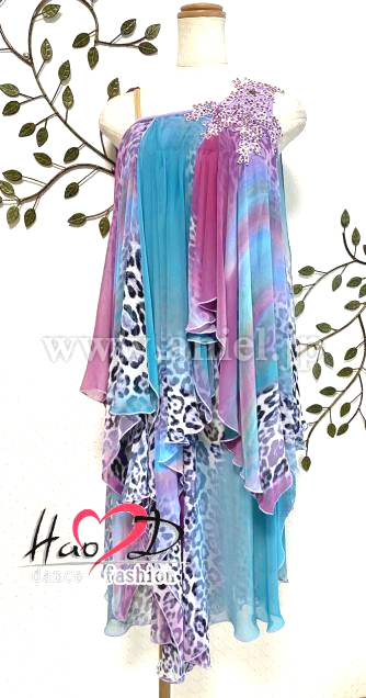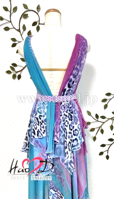 肩からドレープを垂らし、シャーリングで立体感を増して製作し、細かくモチーフを縫付