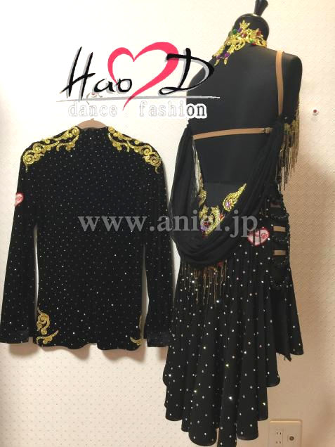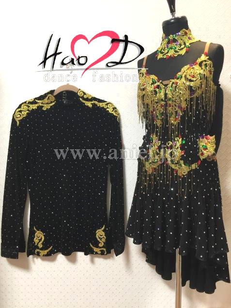 上品なベロアー生地にゴールドのモチーフを飾ったカッコいいラテンシャツ、モチーフと身頃全体に石を散らしており、良く目立つ