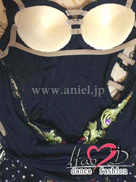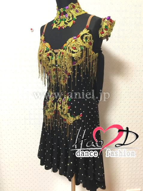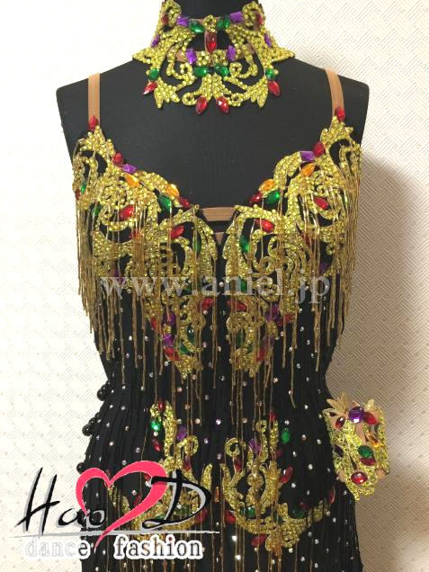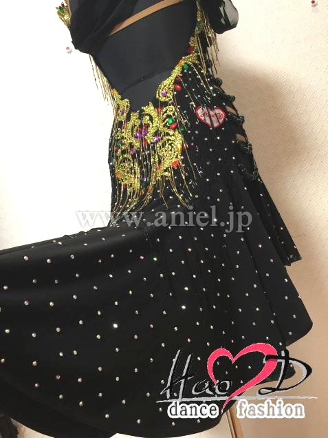 飾り→ゴールドのモチーフにはカラー石と竹ビーズ飾り、黒い身頃全体はスワロフスキーオーロラ石と黒い竹ビーズを付け、とても豪華スカート→脇から裾まで開き、脚を最大限に長く見せ、前後丈とフレアーの分量が違うので、それぞれ違う動きを見せてくれる