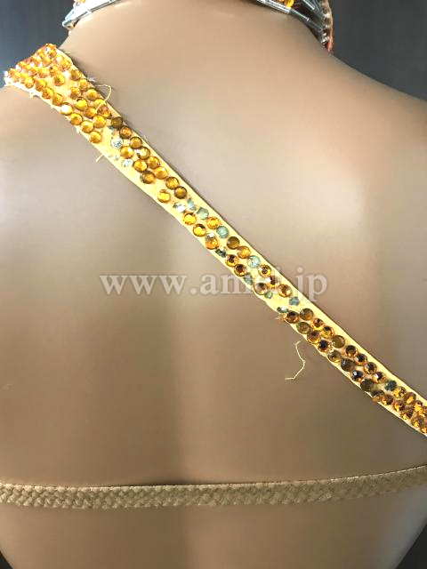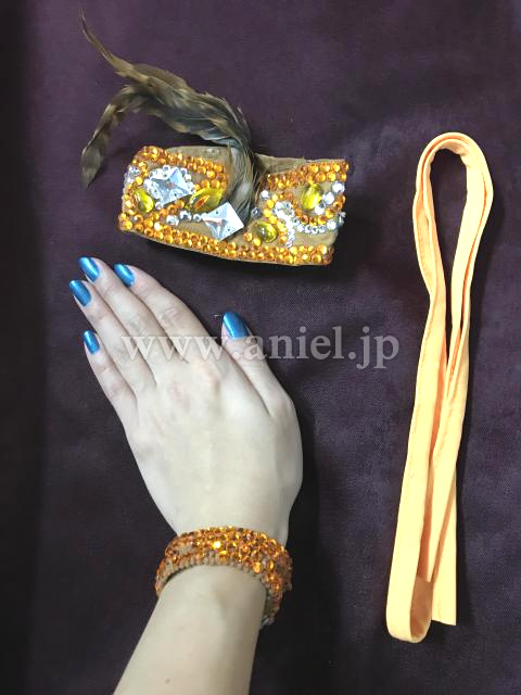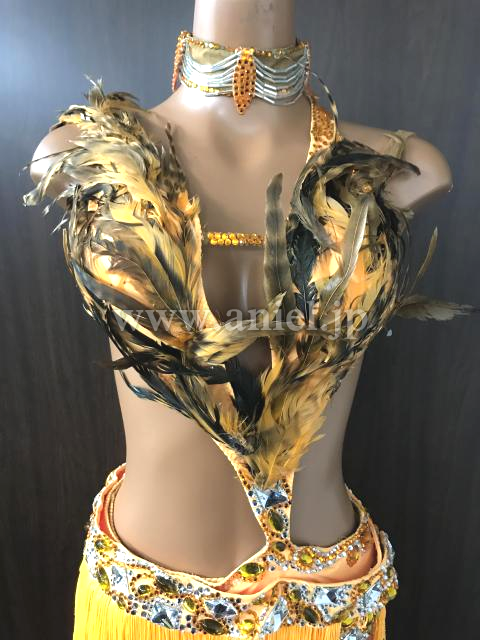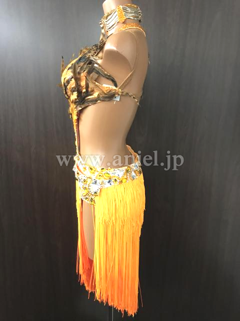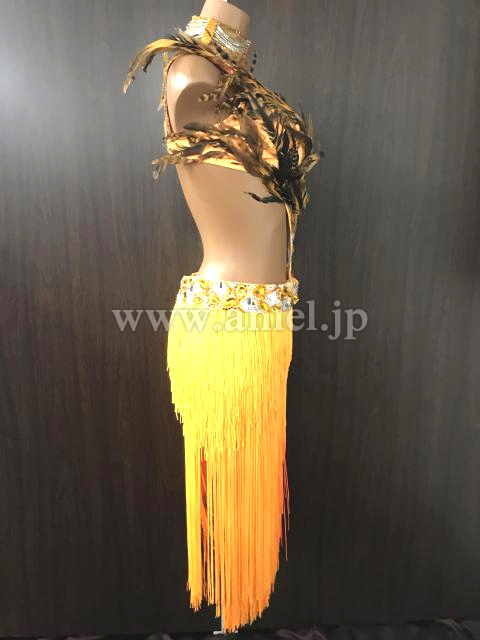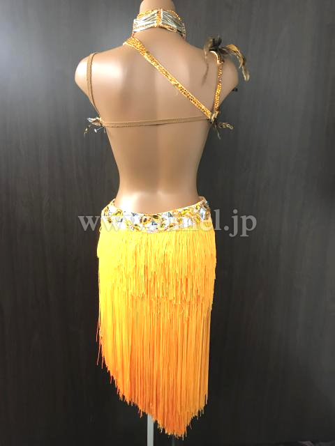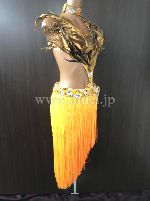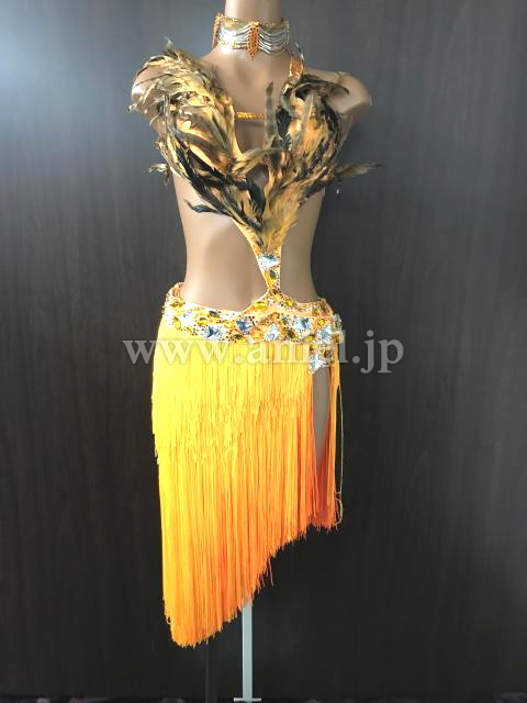 オレンジのフリンジスカートと胸元の羽がゴージャスなドレス