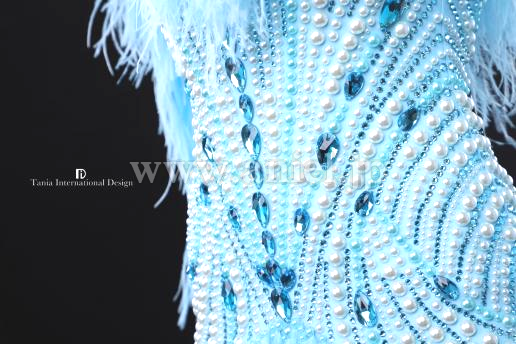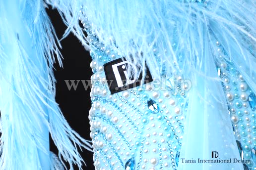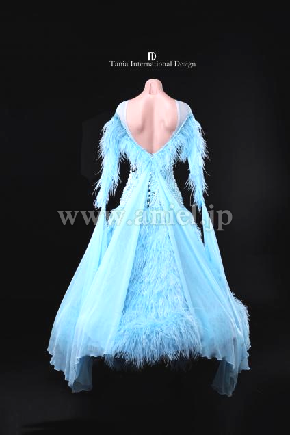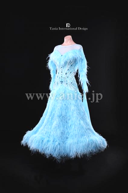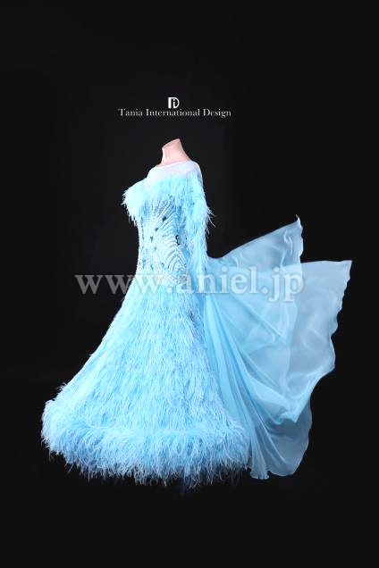 胸元から袖、スカートは羽根が全面につけられ非常に豪華。