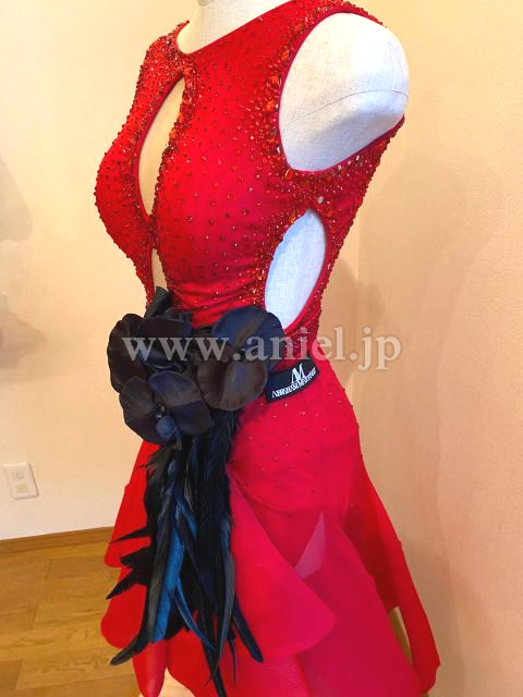 黒の羽根、立体の花のウエスト飾りがインパクトがあります。