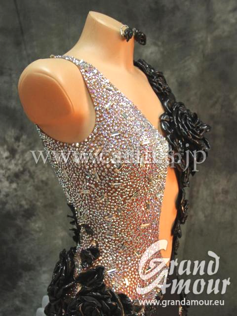 白黒ですが、美しいバラの立体モチーフと可愛らしいボリューミーなスカートが特徴です。オリジナルはクールなイメージでしたが、スカートをチェンジしたことで少しフェミニンな感じが出てイメージのバランスがいいです。大人っぽさも可愛さも共存しています。