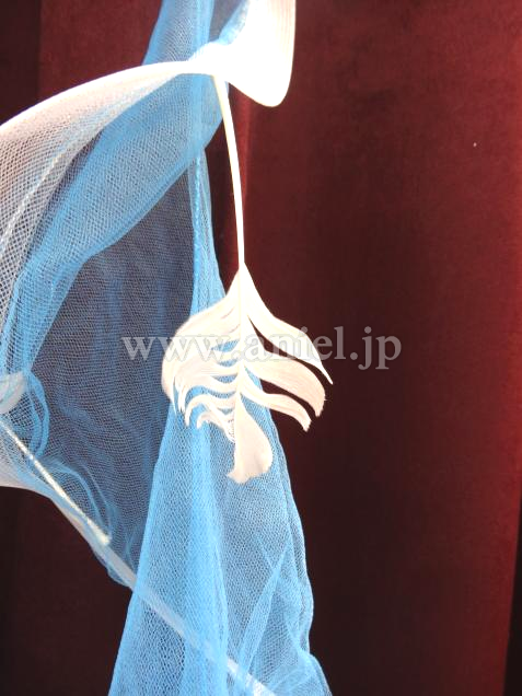 白いバラのモチーフと羽根飾り、ホースヘアがさわやかなアクセントになっており、軽やかで明るい雰囲気のドレスです。