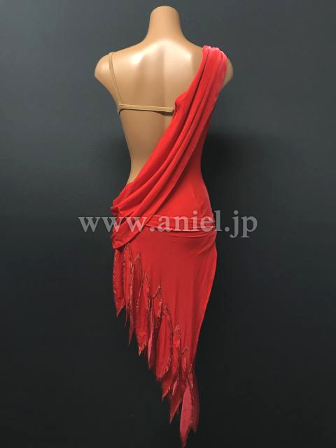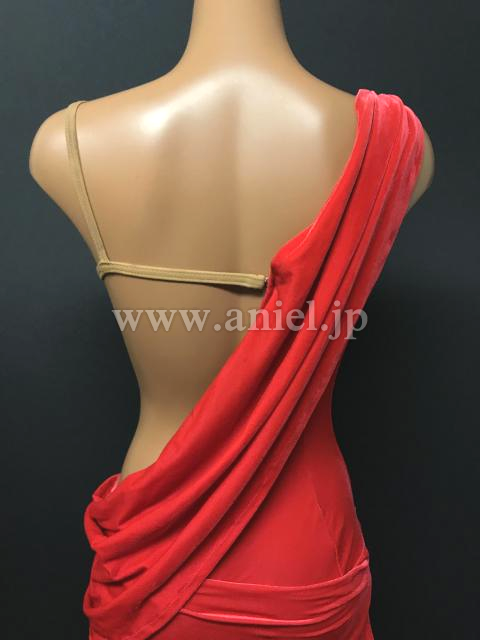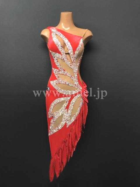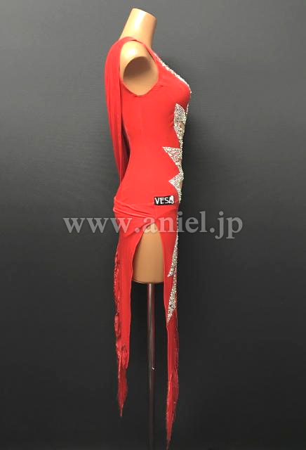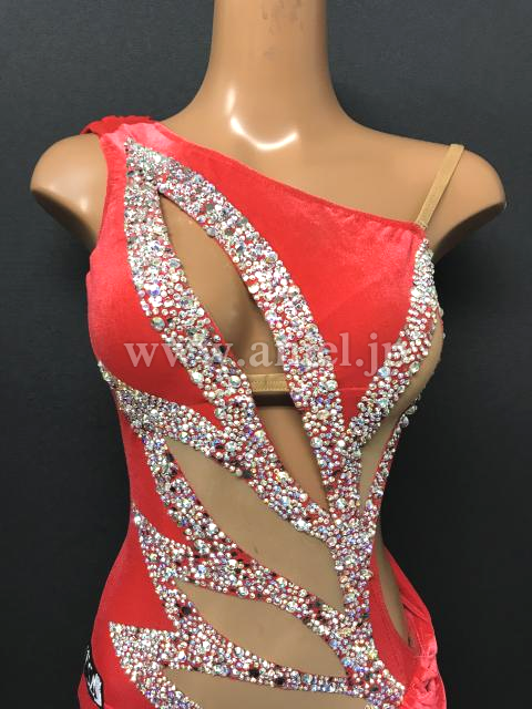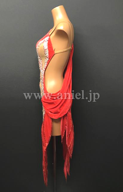 上品なベルベットのような光沢のある赤い生地にベージュの布で個性的な模様がくり抜かれています。模様の周りにはストーンがびっしりと貼られとてもよく輝きます。フロアでとても目立つドレスです。