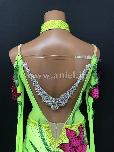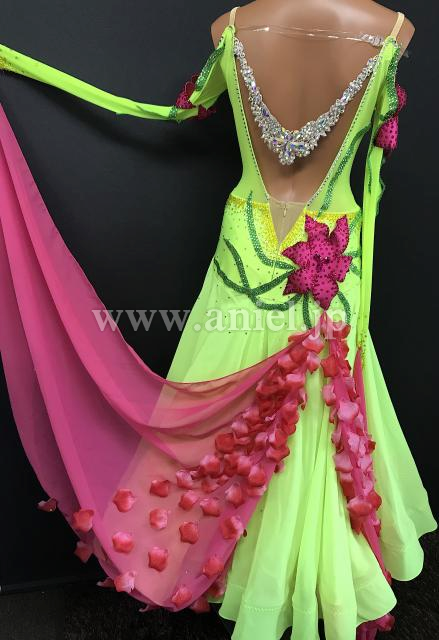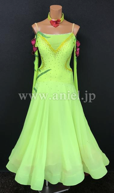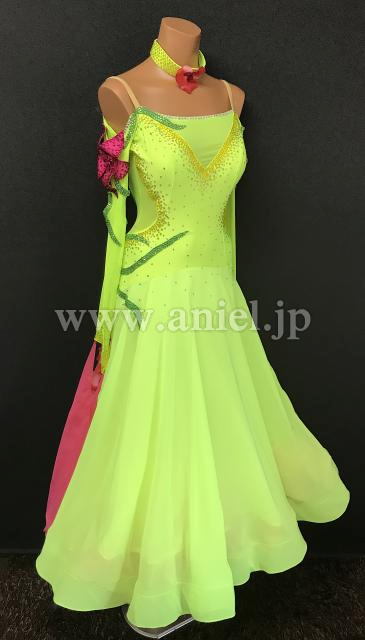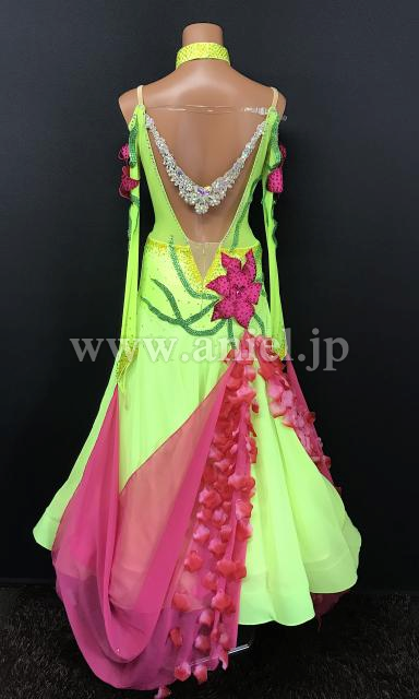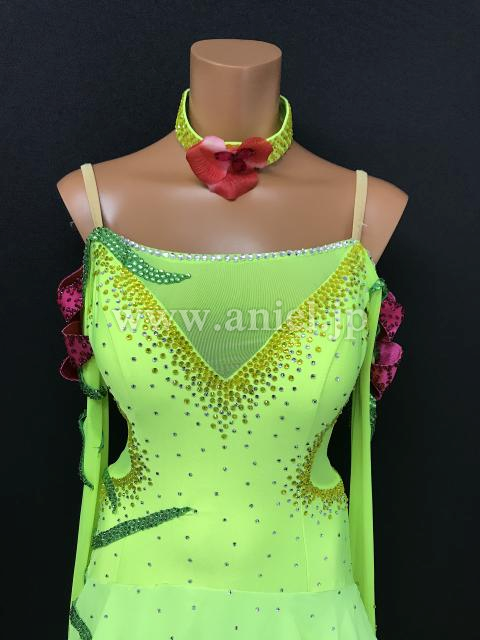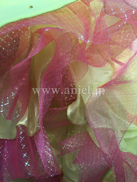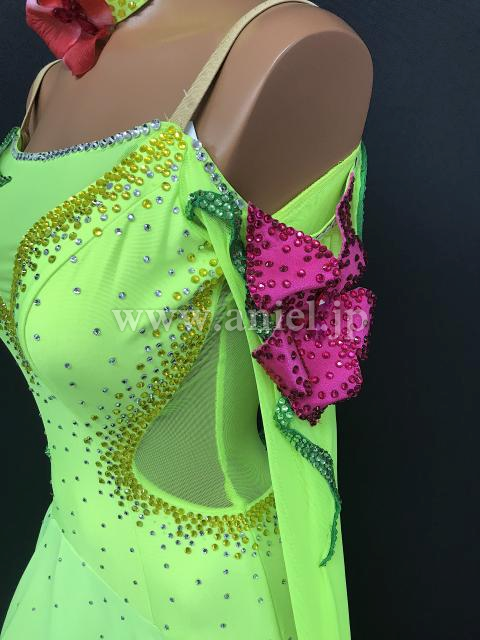 鮮やかな蛍光カラーにピンクが差し色になっているドレスです。