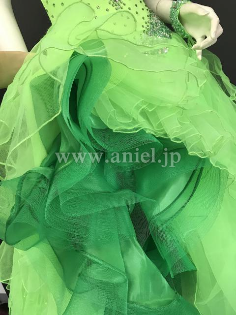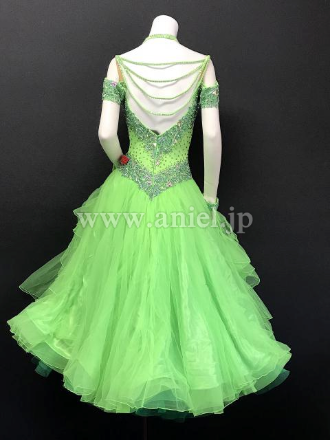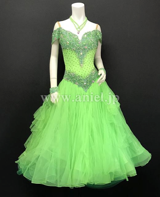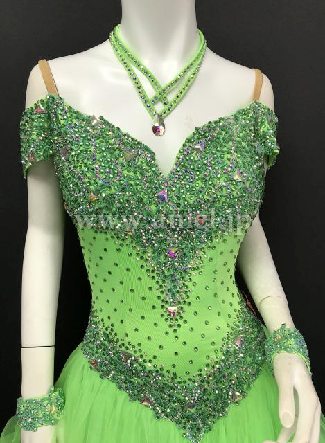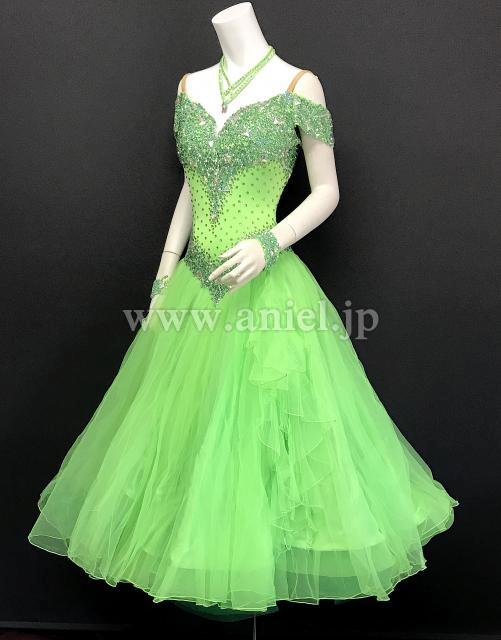 オフショルダーの黄緑のドレス