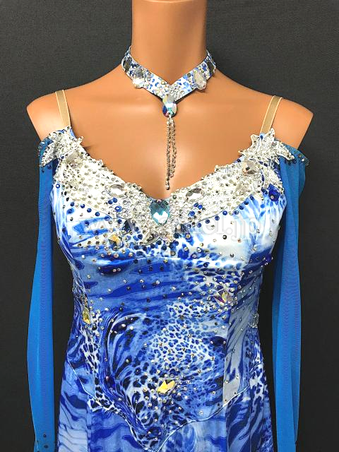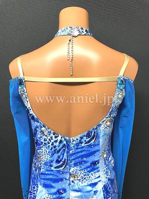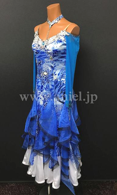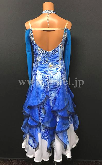 青の美しいヒョウ柄生地にホワイトのインナースカートが映えるドレスです。