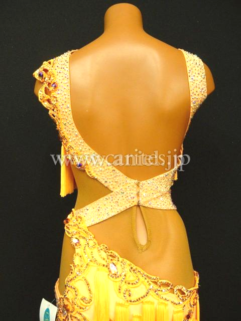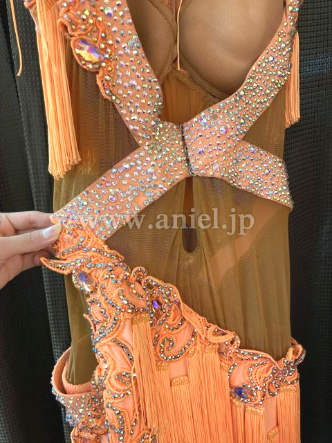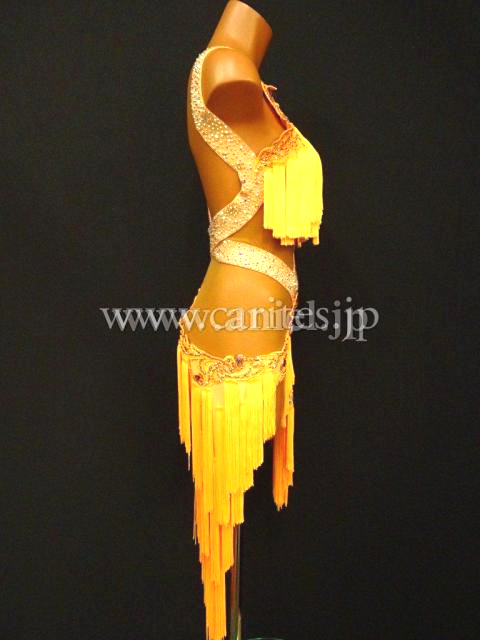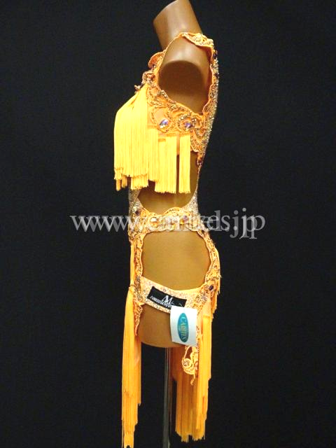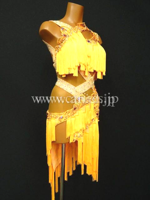 オレンジのフリンジを多く使用した、よく揺れるドレス。