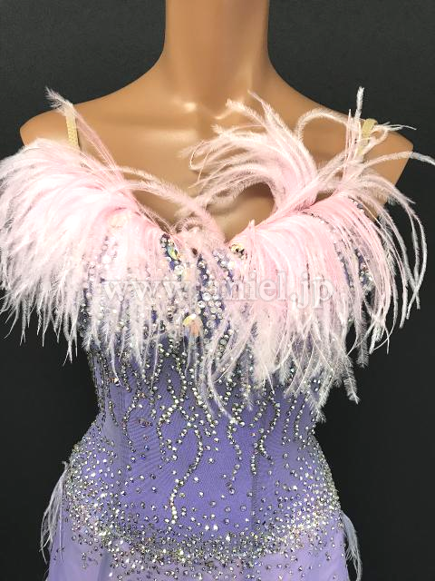 胸元やスカートにピンクの羽根があしらわれ華やか。