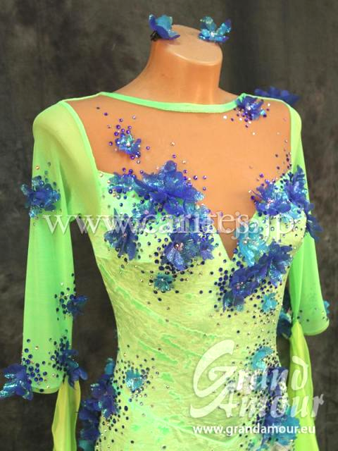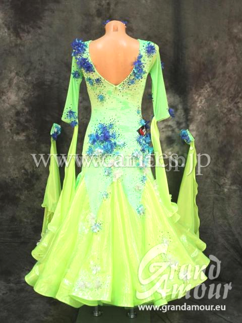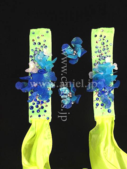 発色のいいライムイエローのクラッシュベルベットにオーロラ加工されたオーガンジーがキラキラと光ります。ハンドメイドの可愛らしい小花がちりばめられ、それに合わせてオーロラのストーンが輝きをプラスしています。午前の明るい芝生に咲いた小花をイメージした一着です。