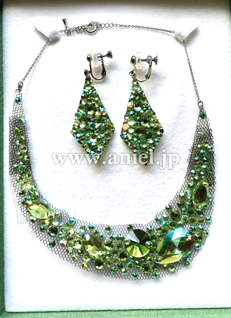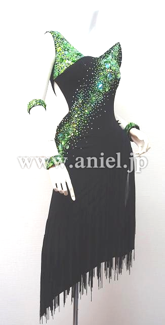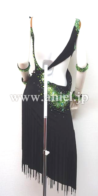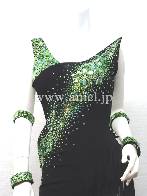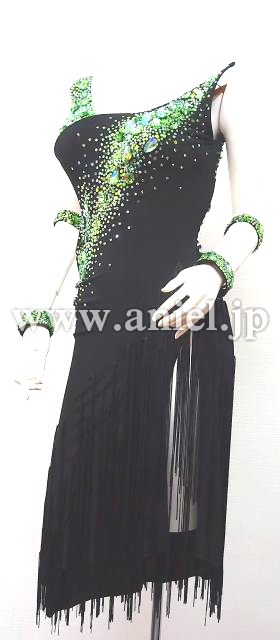 黒のボディに緑のストーンが大小たっぷり貼られて大人ぽくお洒落なドレスです。フリンジのスカートがよく踊ります。