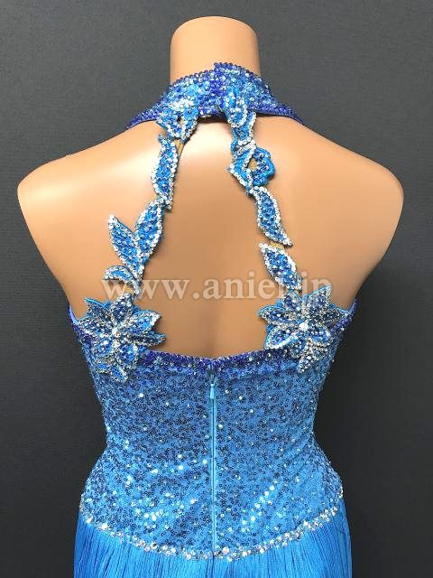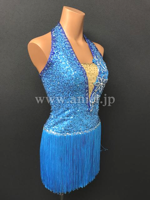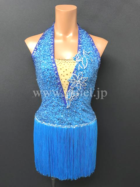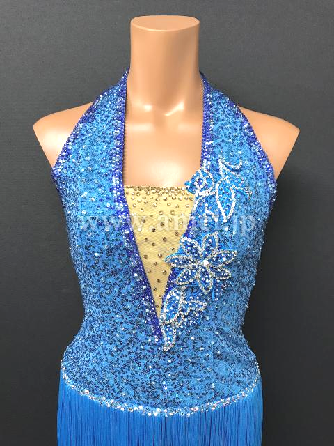 ラメ生地のボディがきらびやかなドレスです。ホルターネックがラテンらしく、