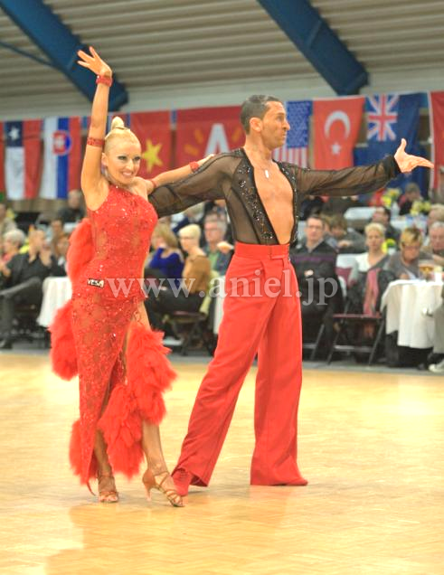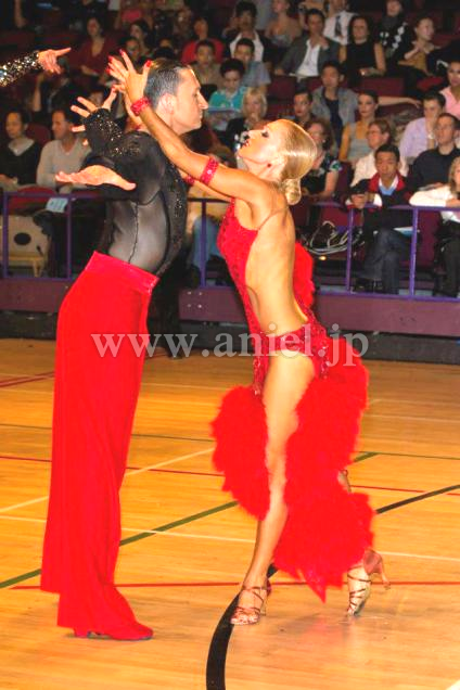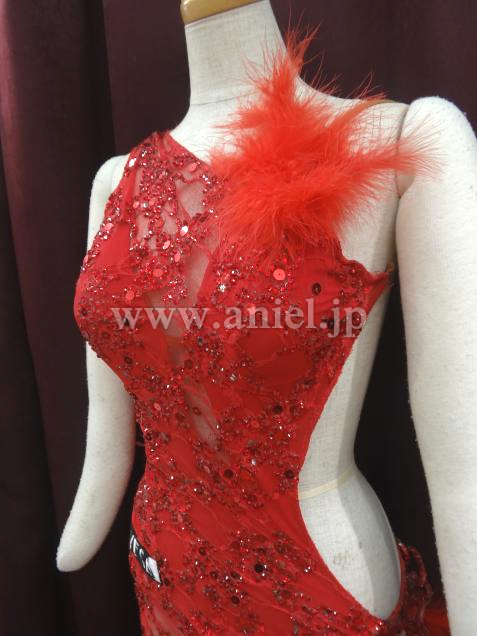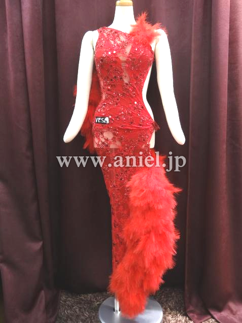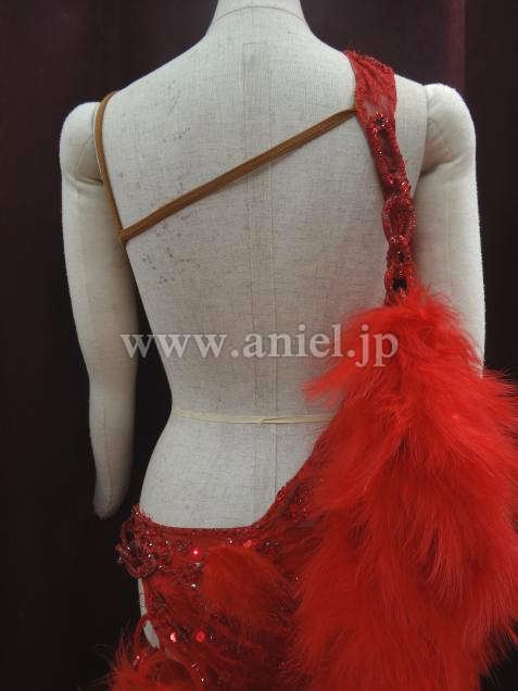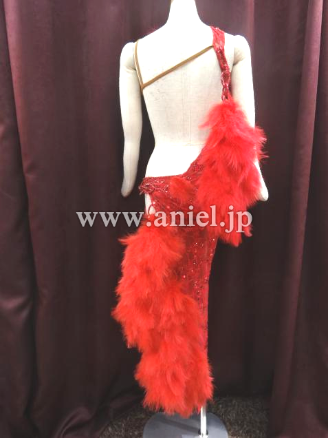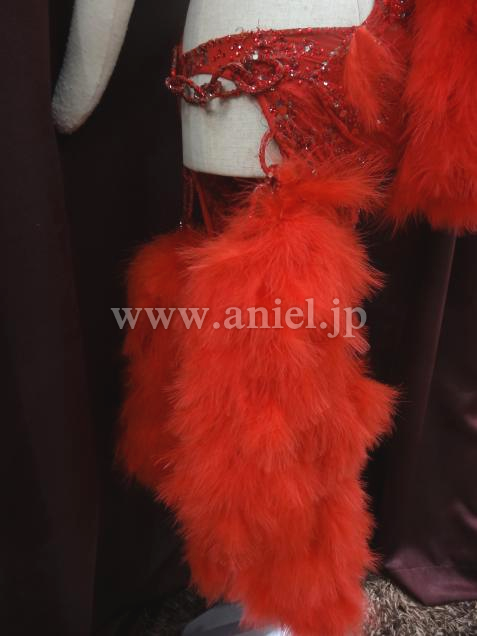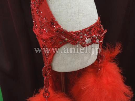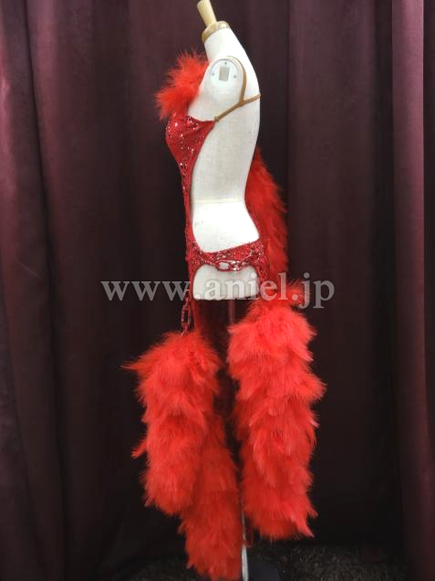 赤のセクシーなボデイから、チェーンで、豪華な羽根のポンポンが、いくつも下がっているデザインです。