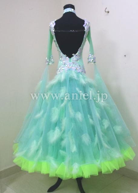 爽やかなペパーミントに羽根やチュール、モチーフレースの装飾が華やかなドレスです。