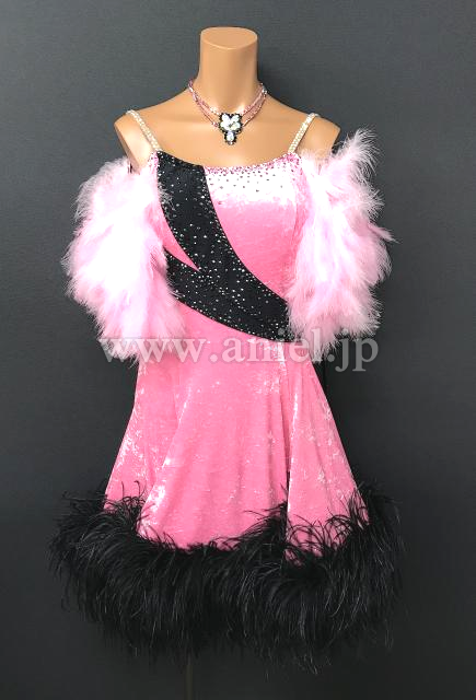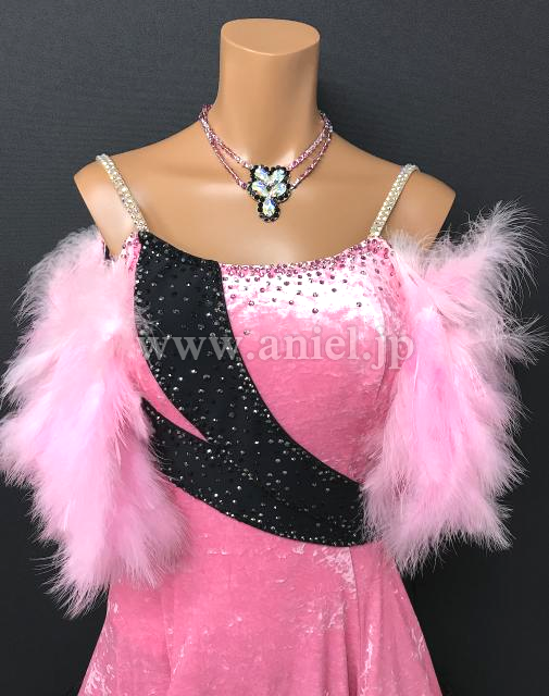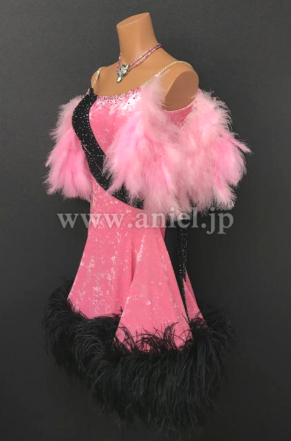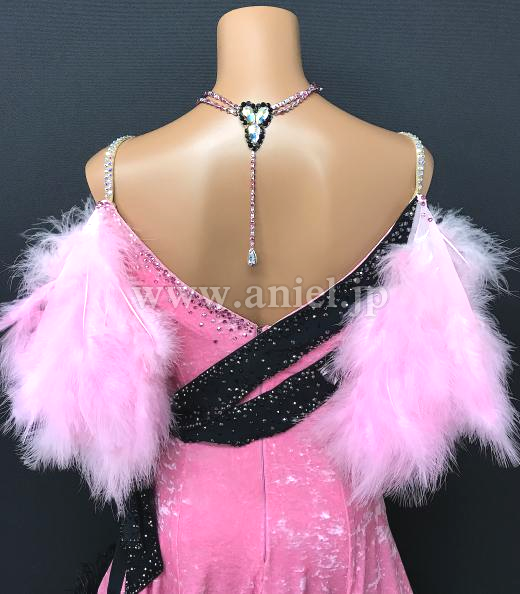 ベルベット生地に羽根の装飾が豪華なドレスです。