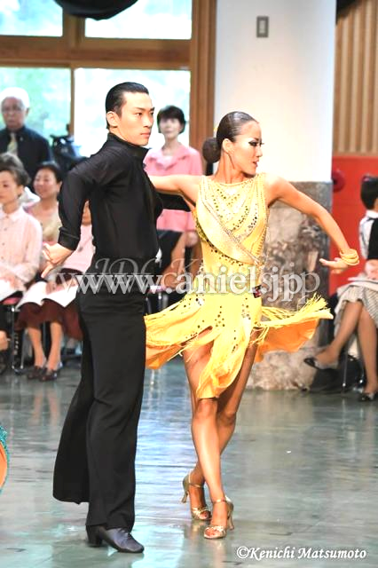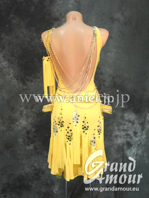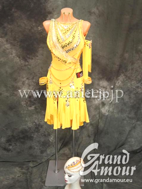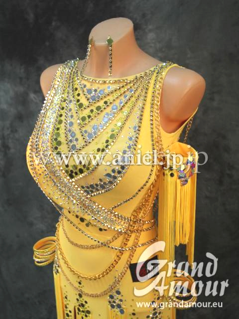 Grand AmourがスポンサーしているJDCの原田彩華選手のスポンサードレスです。2016年のBlackpoolで着用しました。発色がよく、このカラーは暗い会場でも非常に目を引く色です。スカートはフレアのフリンジ付き。ボディはミラーやチェーンで装飾されています。スカートのフリンジはアシンメトリーについているので、踊った時に一定の動きではなく、それぞれ違った動きをして面白いです。チェーンが少し生地と擦れて色あせていますが、遠目から見れば問題無い程度です。腕輪にも、フリンジが付いていて面白いです。