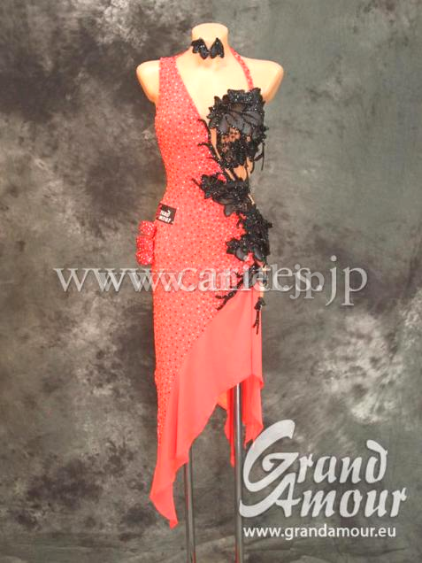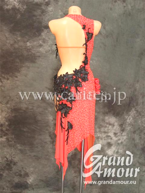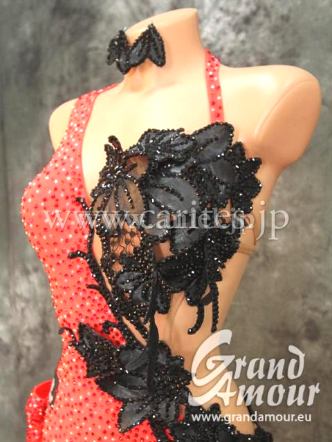 発色がよく人気のカラー、タンゴフレアとシックなブラックのコンビネーションです。モチーフはレザー加工された光沢のあるブラックのモチーフ。ドレスは適度な重みを考えられたクレープ生地タイプのワンピースドレスです。背中の半月ラインがインパクトありなかなか面白いです。クレープ生地にはスカートの一部分を除いてすべてにストーンが散りばめられ、実物は写真よりも輝いて豪華に見えます。どちらかといえば競技向きですが、曲やイメージが合えばデモにも着ていただけるドレスだと思います。