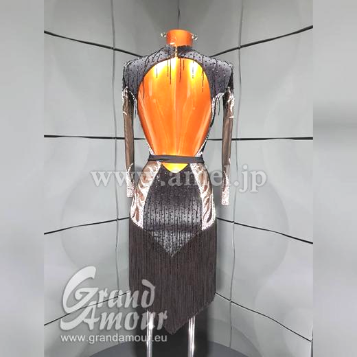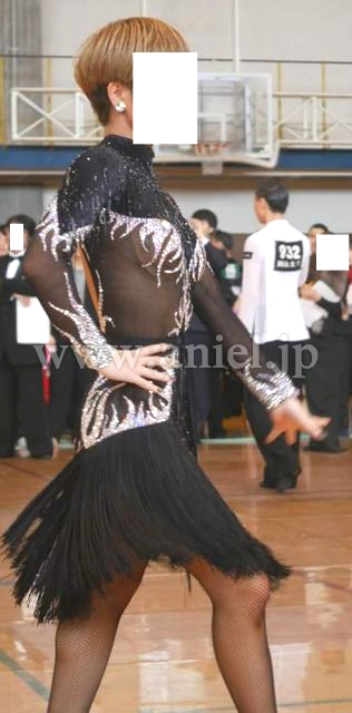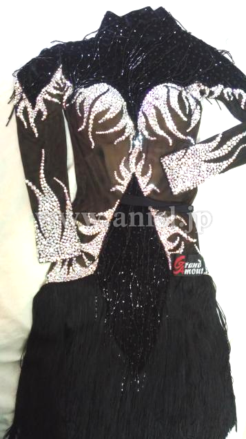 ストーンがたくさんついていて、とてもよく光ります。スカートは3段フリンジスカートになっていて、よく舞い、動きを大きく見せてくれます。ベロア生地の部分には、竹ビーズフリンジが散りばめられていて、動くとよく舞います。