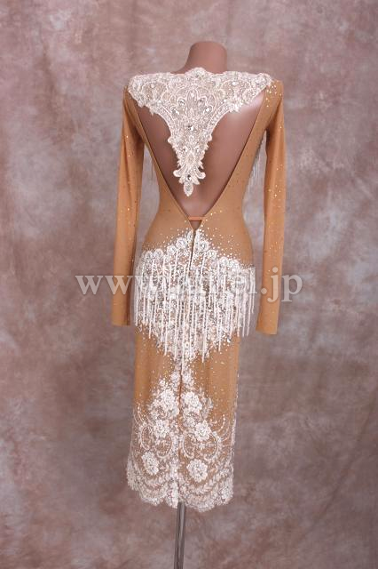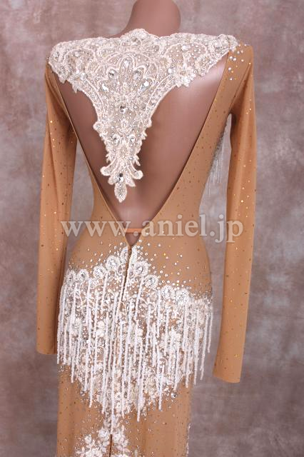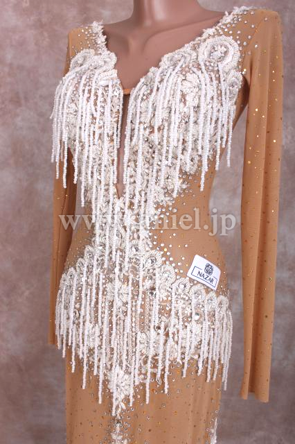 ベージュのボディに白のレースやビーズフリンジで美しく装飾されています