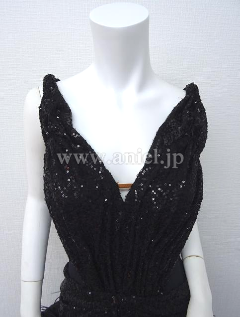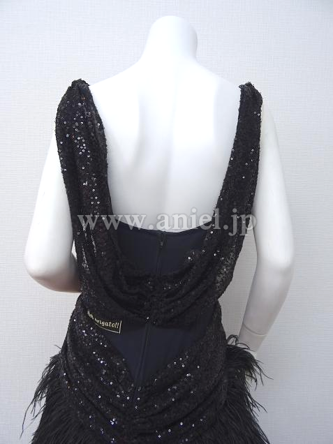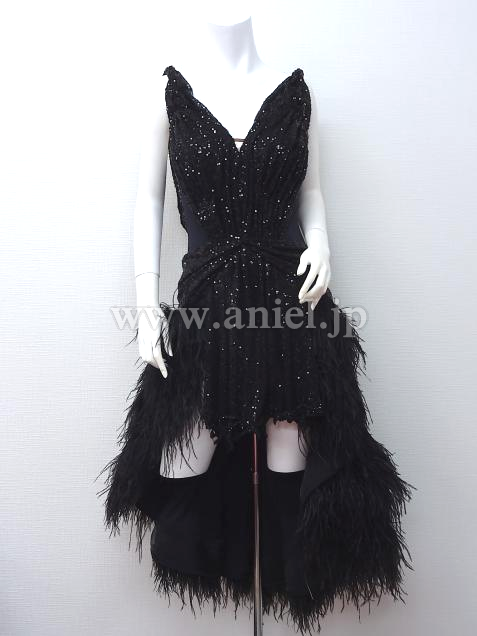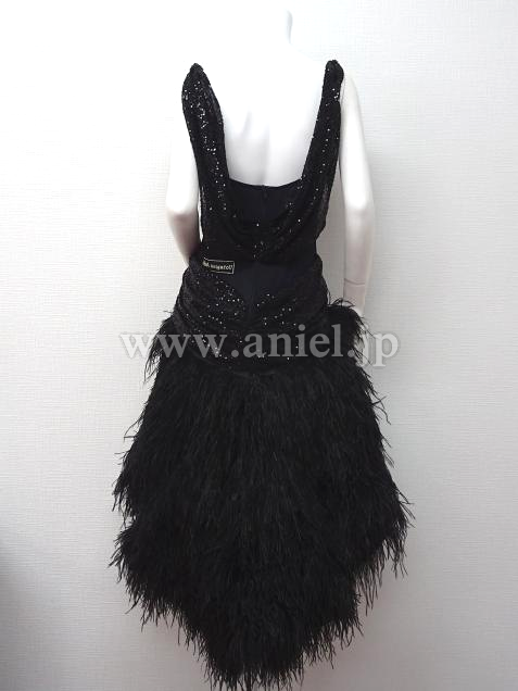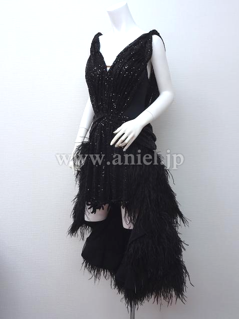 黒のスパンコール生地のボディに羽根たっぷりのスカートのドレスです。
