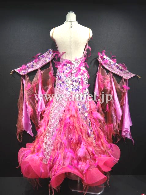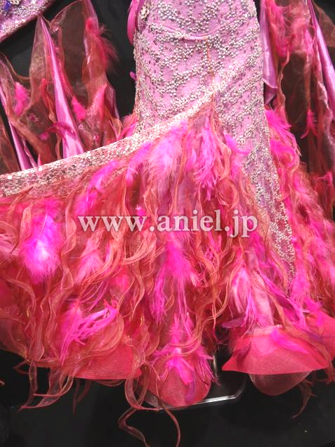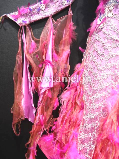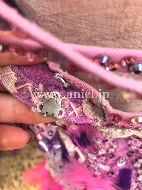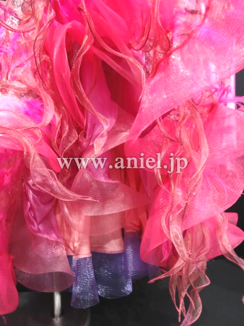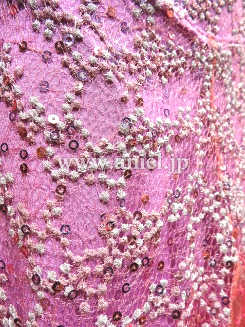 ベリーベリーのイタリア製のレース生地が特長です。色は写真よりも実物の方が少し濃いめだと思います。ベリーベリー・マゼンタ・ピンク・パープルなど、イタリアらしいオシャレなカラーの組み合わせです。羽や花のモチーフがところどころにあしらわれていてすごくボリューム感もあり豪華です。ちょっとかわっているので、フロアでもすごく目立つと思います。