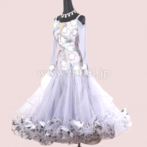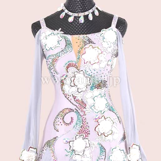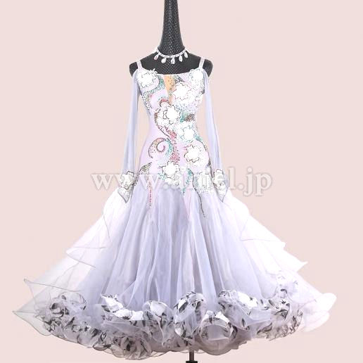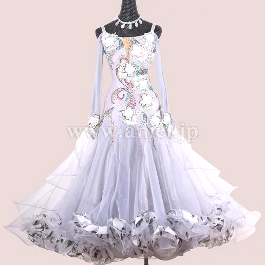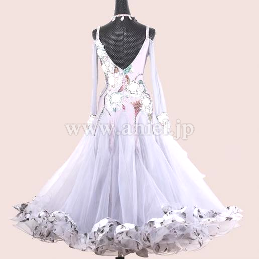 淡いグレーにカラフルなストーンの装飾が映えるドレスです。